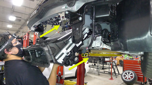 - 将车辆驶离举升机。请参阅举升车辆 - 双柱举升机。
