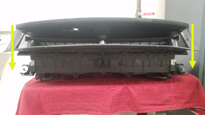 注轻轻地将总成置于平坦表面上,风扇朝下。注在接合锁片之前,先对准固定销。确保格栅在锁片内侧而非外侧滑动。