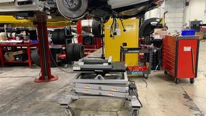 - 完全降下副框架举升机,断开供气软管,然后将副框架举升机从车辆下方移出。