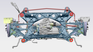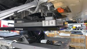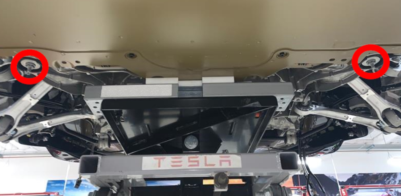 - 升起副车架举升机,直至副车架刚好接触到车身,然后使用电动工具安装将后副车架固定到车身的螺栓(4 个)。