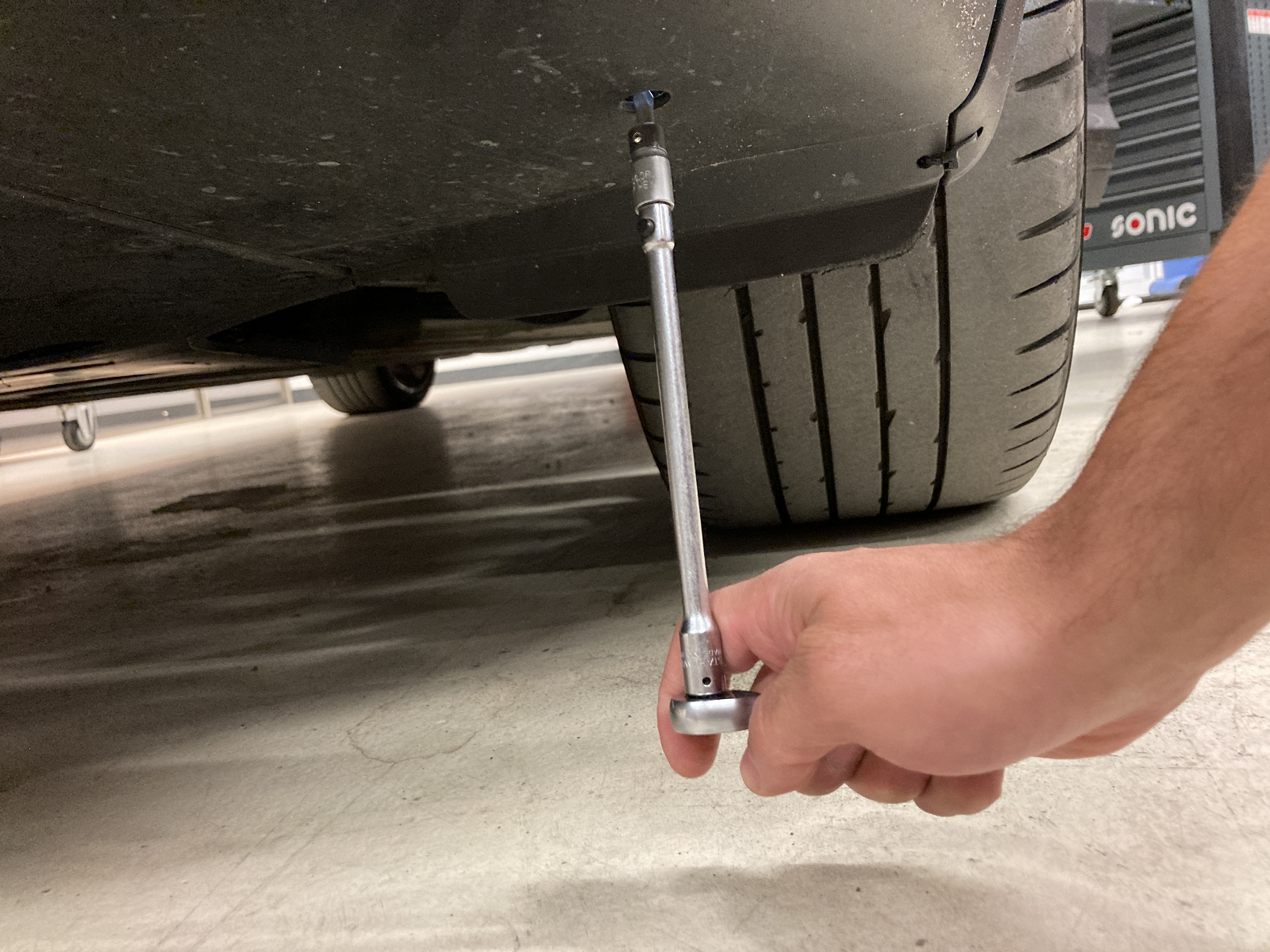 - Insert an 8 mm socket wrench or Philips socket bit (as necessary) in the hole in the lower valance below the LH fog light.
