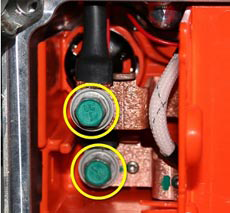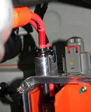 - Release the bolts (x2) that secure the HV cables to the busbars inside the forward junction box (torque 4 Nm).