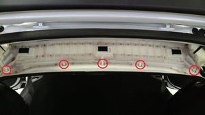 Note1x fir tree clip on the lower A-pillar, 4x fir tree clips on the B-pillar, 1x fir tree clip on the lower C-pillar.