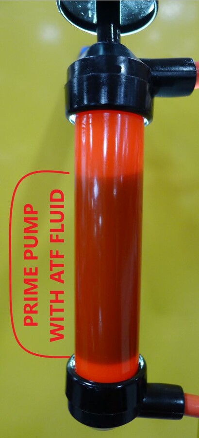 - Set up the fill process by putting the container with the measured fluid in the drain basket, and then fully submerge the input hose of the fluid transfer pump and prime the pump.