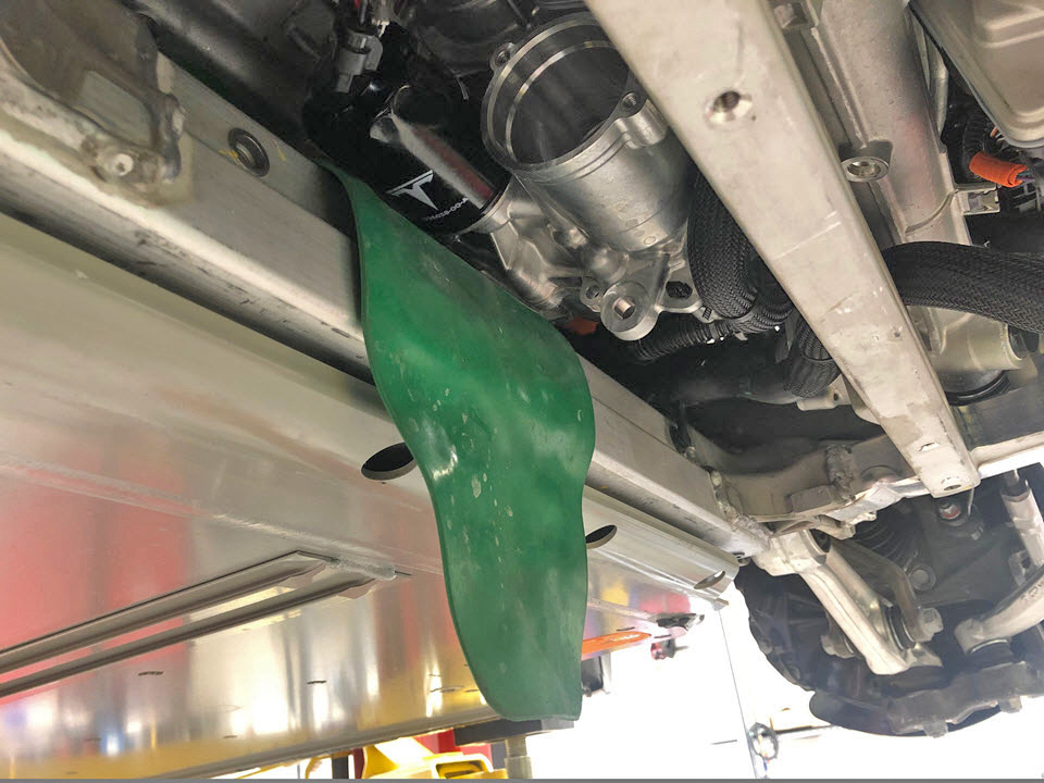 NoteTesla recommends that the oil filter is replaced with a new one upon removal. Any oil filter with visible corrosion or leaks must be replaced.NoteAllow at least 10 minutes for the gearbox fluid to drain from the front drive unit, or until a slow drip exits the front drive unit.