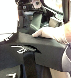 - If the vehicle has a molded-in-color C-pillar middle trim panel, route the seat belt lower forward anchor and seat belt tongue through the C-pillar middle trim panel before installing the lower forward anchor bolt.