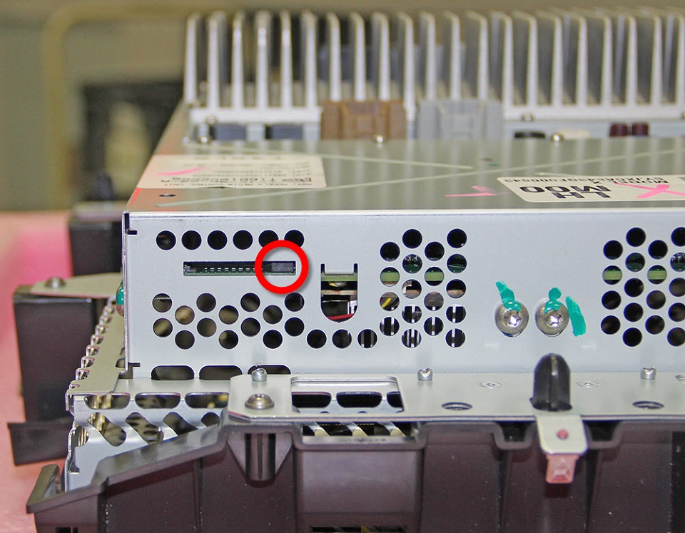 - Insert the new SD card with the pins facing towards the touchscreen.