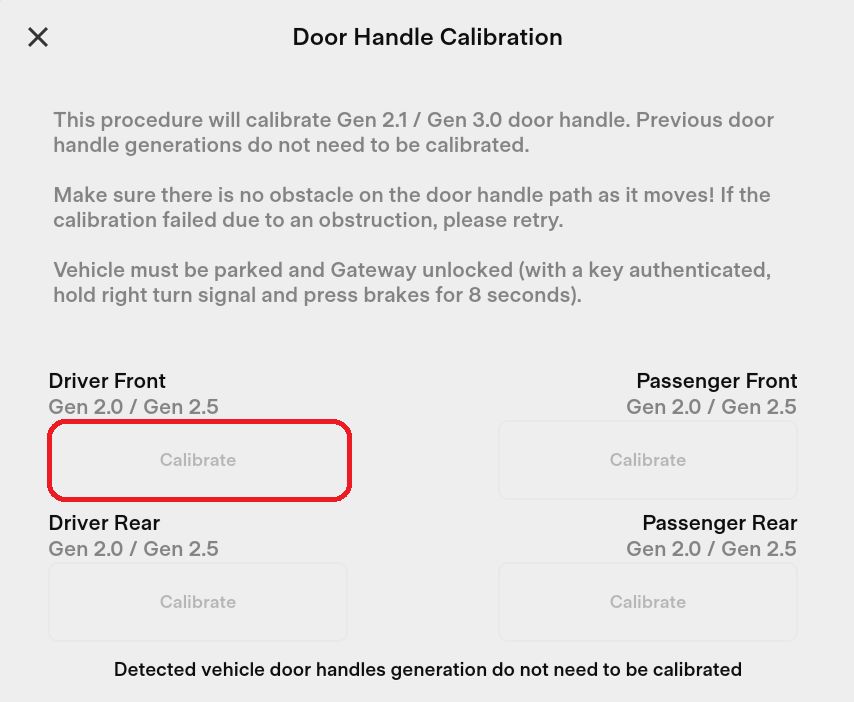 NoteThe vehicle software must be 2023.12 or above in order to run door handle calibration on the UI.