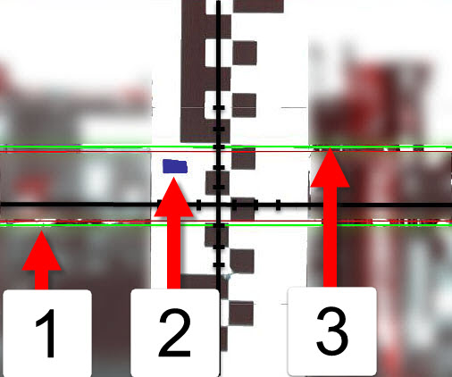 In the "Main" and "Narrow" camera views, determine if the top edge of the tape is between the positive 1 and negative 3 green degree lines.