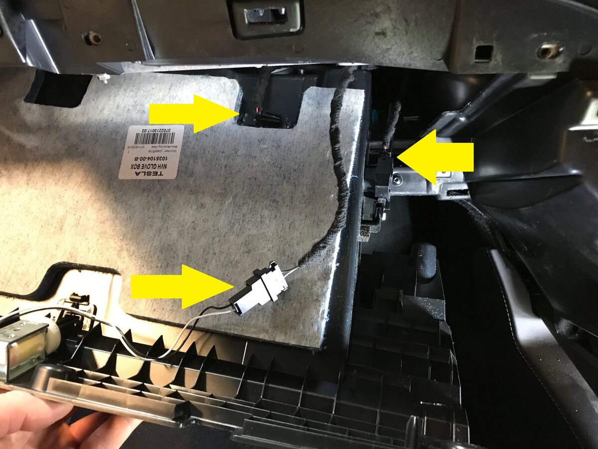 Remove glove box from vehicle and disconnect the connections from the back of the glove box