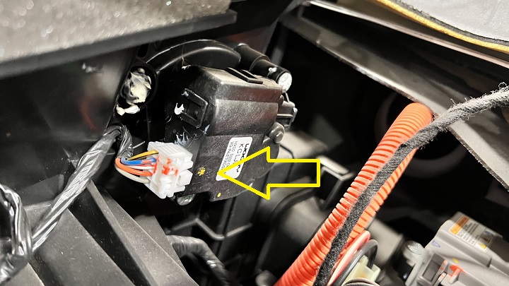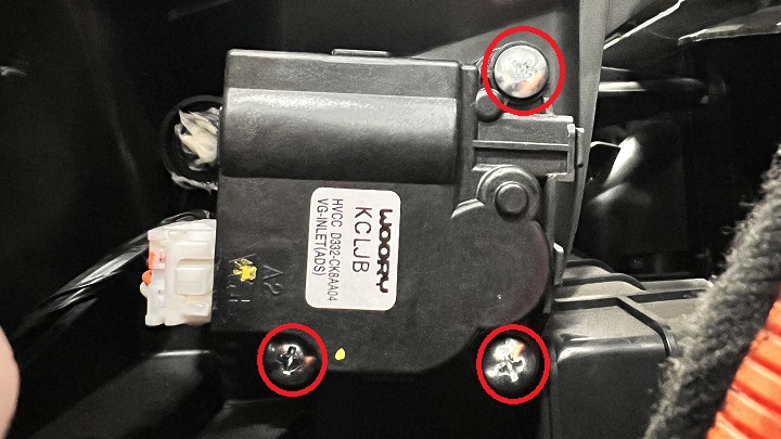 Disconnect the defrost actuator harness connector, remove the screws (x3) that attach the actuator to the HVAC assembly (torque 1 Nm), and then remove the actuator from the vehicle.