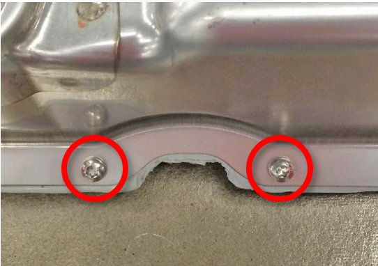 - Remove and discard the screws (x2) that attach the broken aero shield support tab to the HV battery, and then remove and discard the broken aero shield tab.