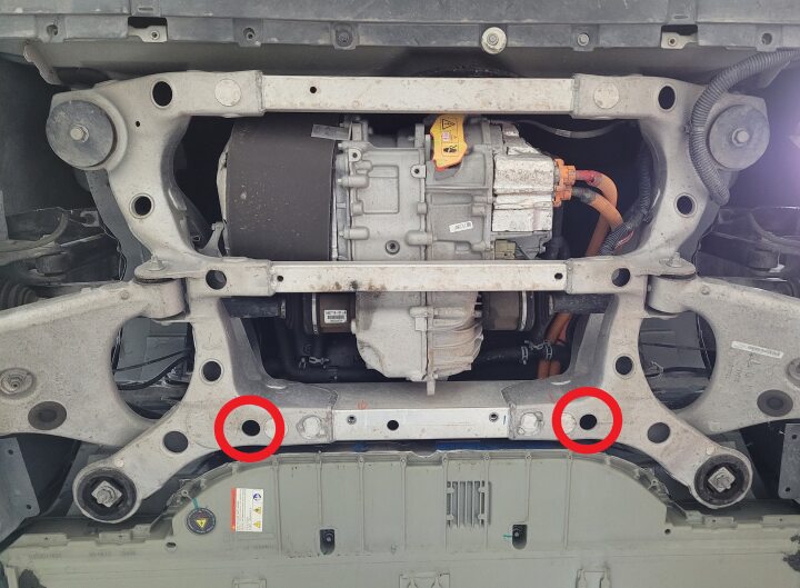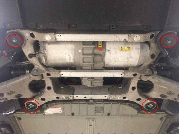 - Install the bolts (x4) that attach the subframe to the vehicle (torque 140 Nm).