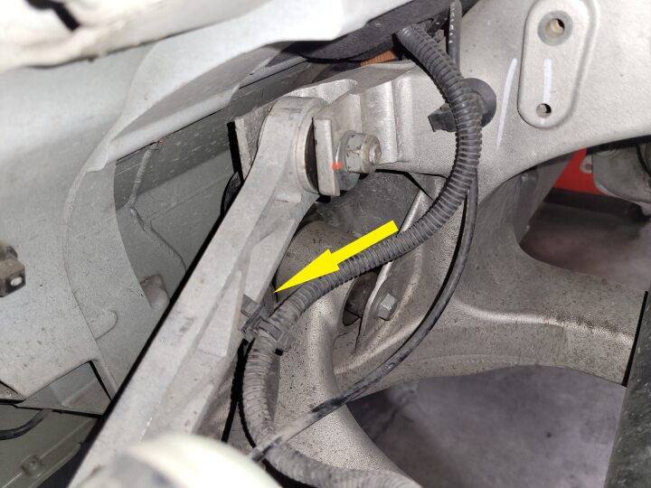 - Release the clip that attaches the harness to the LH rear toe link assembly.