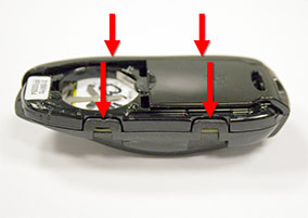 - If using a flat screwdriver: Hold the transmitter in one hand. Place the blade of a flat screwdriver or similar object on the edge of the side panel, and then press away from the transmitter to release the side panel. Repeat this step on the other side.