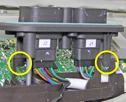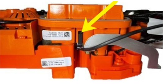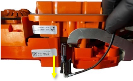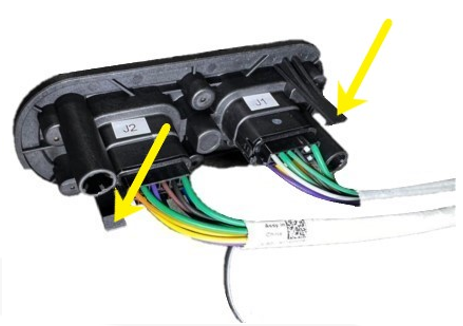 - Release the retaining clips (x2) that attach the LV Rapid Mate connector to the HV battery, and then slide the LV Rapid Mate connector up and off of the dowel pin.