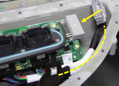 - Route the large LV Rapid Mate harness along the rear RH side of the ancillary tray, and then connect the harness to the ancillary tray circuit board RH side connector. Perform a “push-pull-push” check at the connector to make sure that it is properly secured.