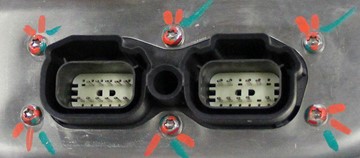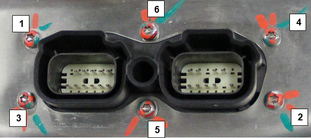 - Install new T25 screws (x6) to attach the LV Rapid Mate connector to the ancillary cover. Torque the screws to 2.8 Nm in the order shown. Use an orange paint pen to mark the head of each screw after it is torqued.