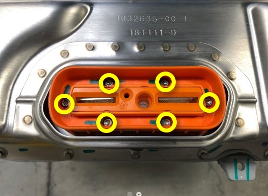 - Install the top ring around the HV Rapid Mate connector, and then install new T25 screws (x6) to attach the HV Rapid Mate connector to the ancillary cover (torque 2.8 Nm). Use an orange paint pen to mark the head of each screw after it is torqued.