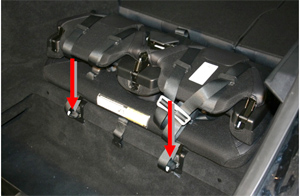 - Ensure that the side latches are engaging correctly into the LH and RH strikers. If the latches are aligned too high, the trunk floor carpet is keeping the seat from sitting in the proper position. Kneel on both sides of the seat cushion, using your body weight to compress the seat and carpet. The carpet should stay compressed, keeping the hooks in proper alignment permanently.