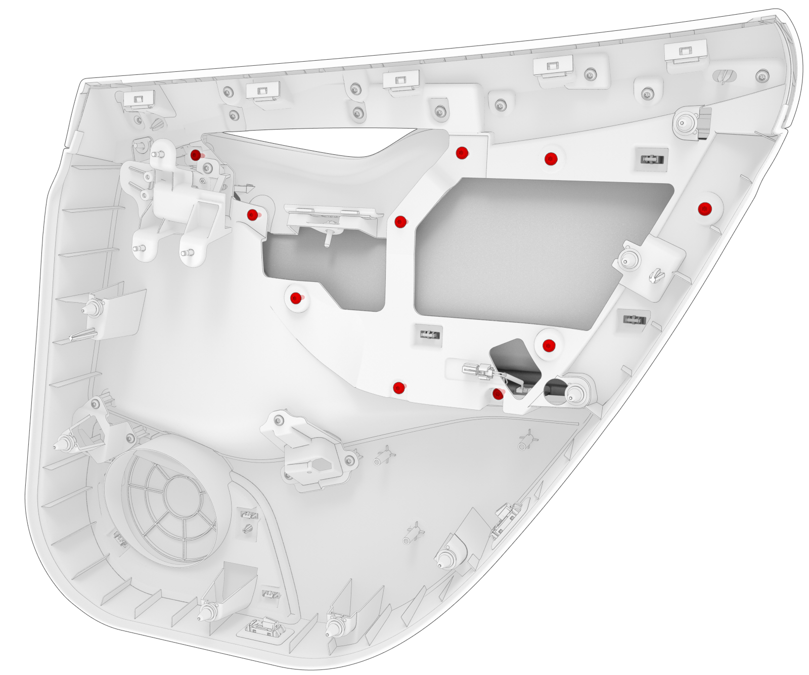- Remove the screws (x10) that attach the rear door trim pad to the rear door panel assembly (torque 2.8 Nm).