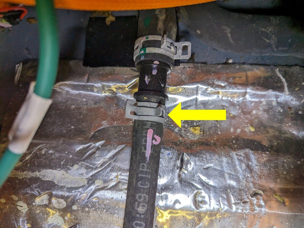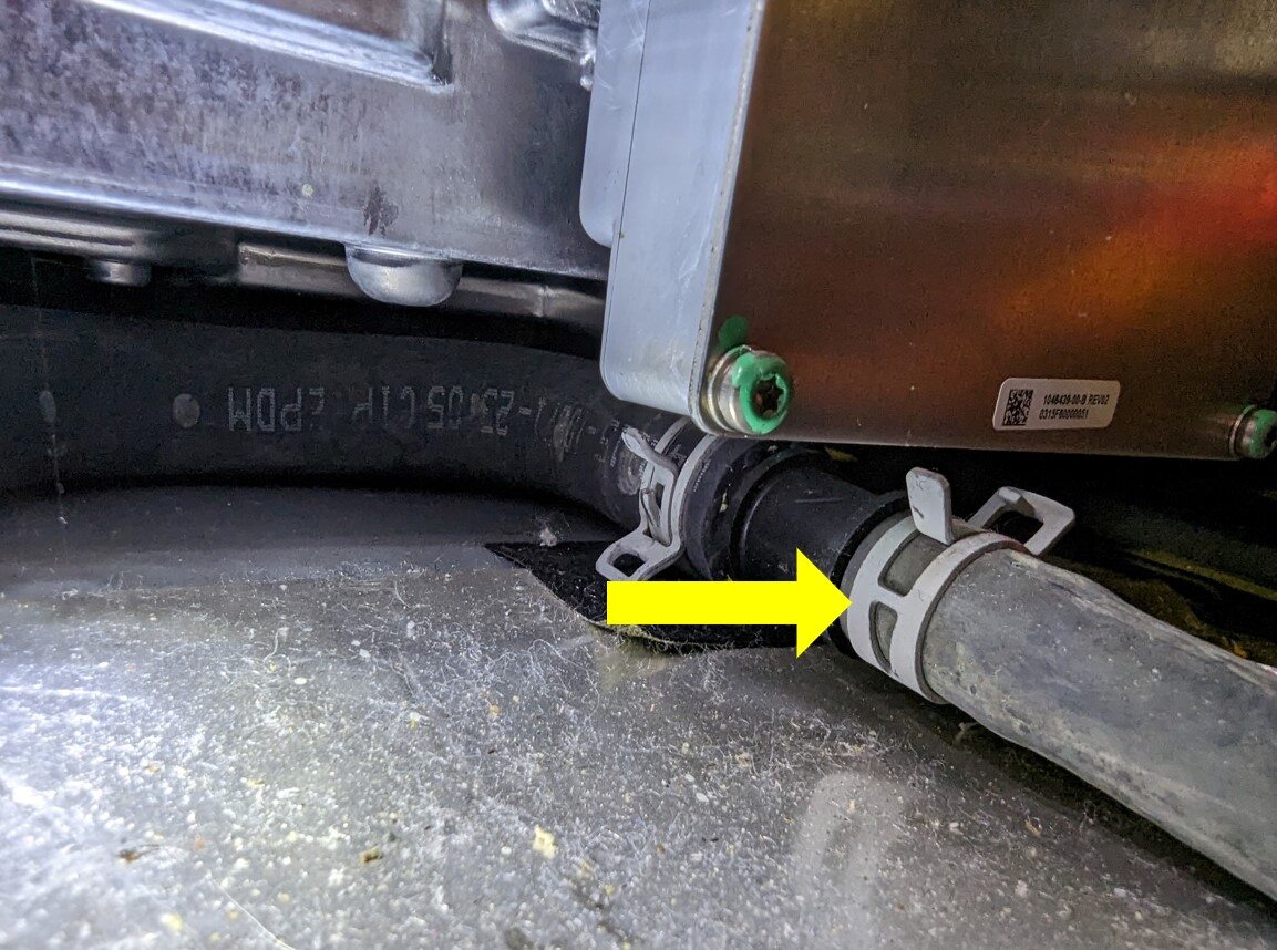 - Release the barrel clips (x2) that attach the coolant hose to the body to gain access to the slave charger fasteners.