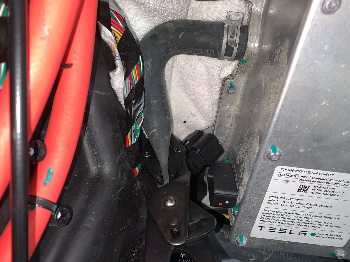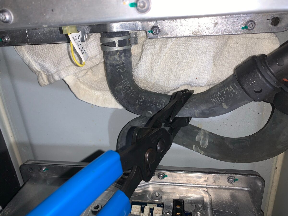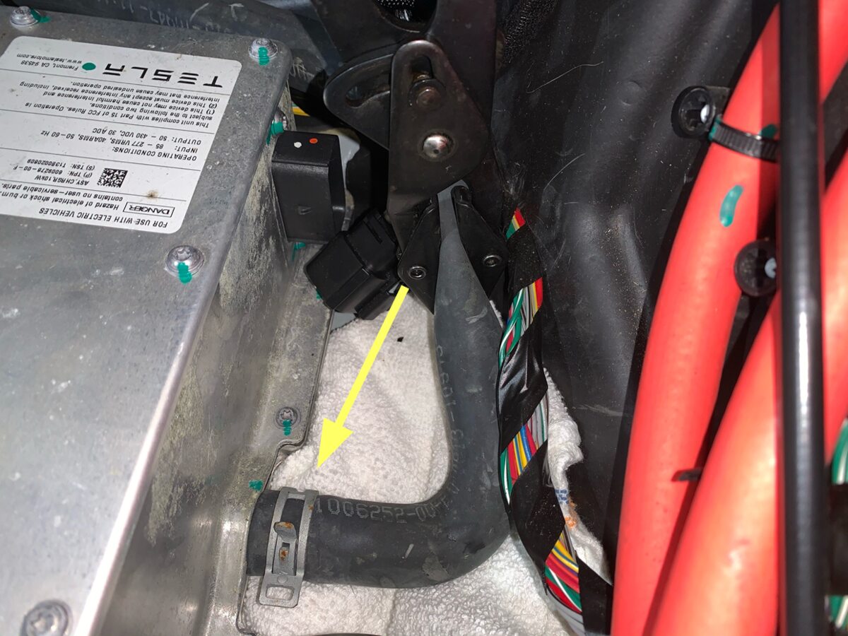 - Lift the slave charger slightly, and then put absorbent material under each coolant hose.