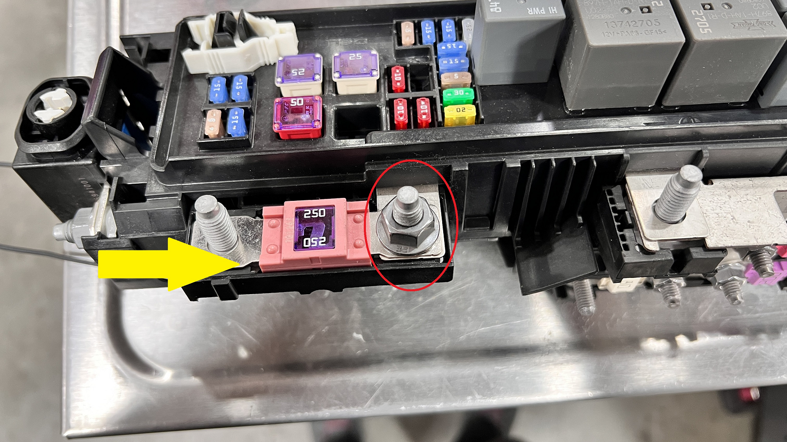 - On the new (replacement) fuse box, install the 250 Amp fuse and nut that attaches the fuse (torque 5 Nm).