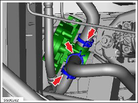 - Release the clips (x3) that secure the coolant hoses to the coolant valve. Release the hoses from the valve.