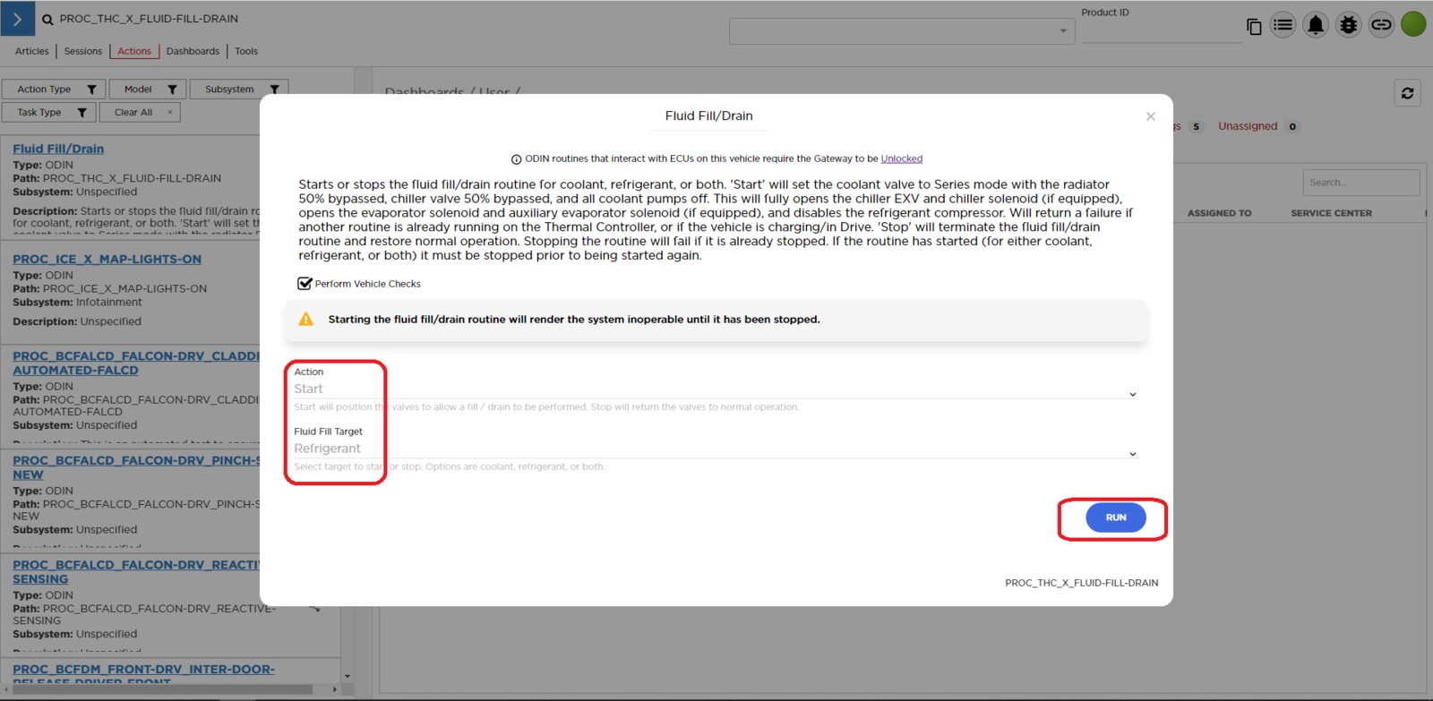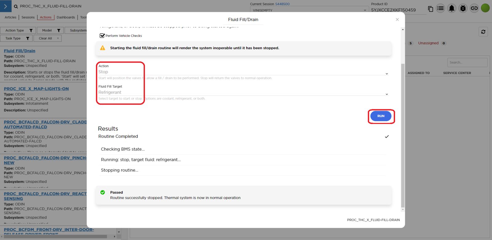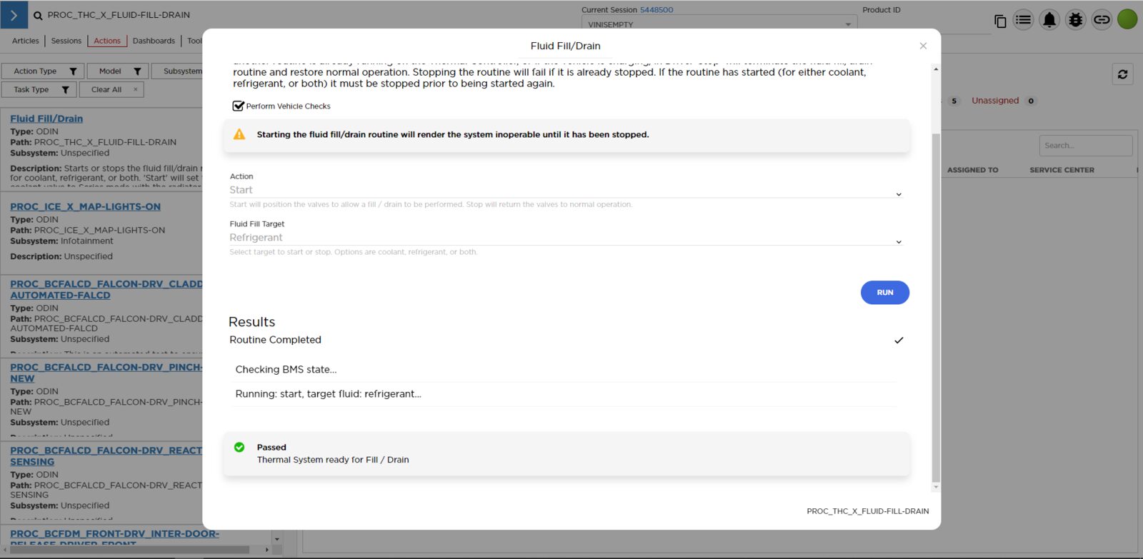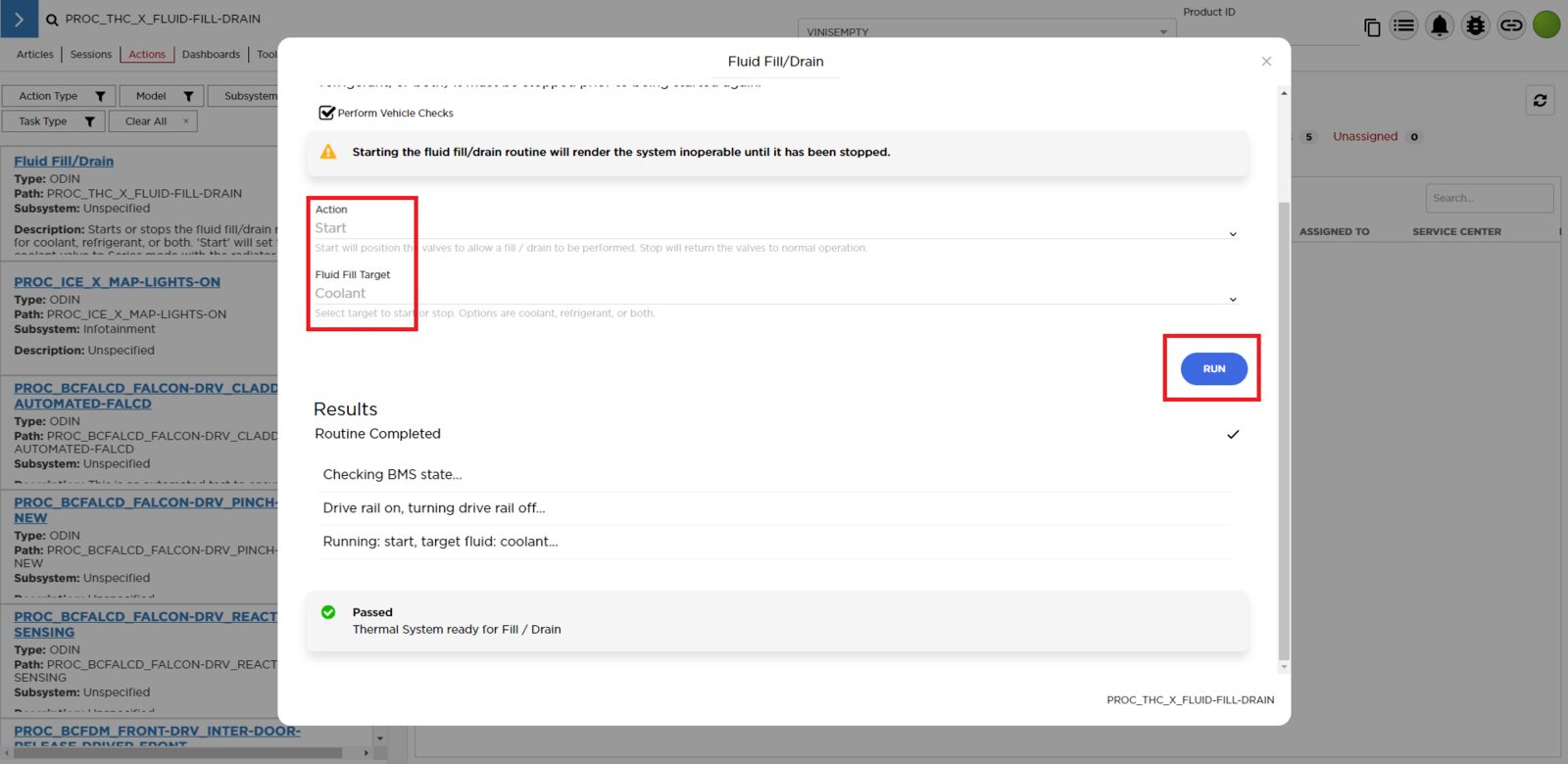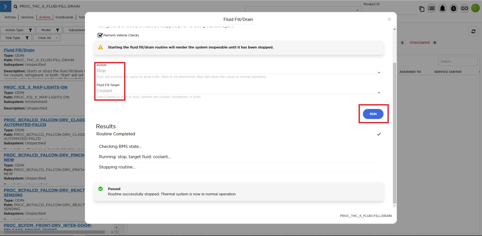 - Select ‘Actions’ tab and search for ‘PROC_THC_X_FLUID-FILL-DRAINvia Toolbox: (link)via Service Mode: Thermal ➜ Actions ➜ Stop Fluid Fill/Drain’