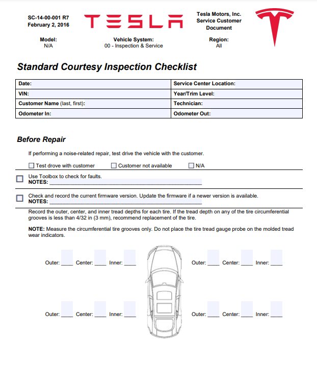 NoteSC-14-00-001 Standard Courtesy Inspection Checklist, While performing courtesy inspection, Note any abnormal tire wear that could indicate the need for an alignment