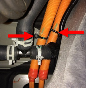 - Release the cable ties (x2) that secure the HV cables to the body of the vehicle.