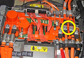 - Remove the bolt that secures the HV fuse ground strap to the body (torque 5.5 Nm).