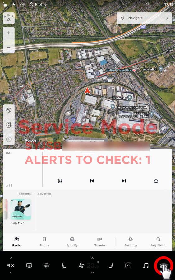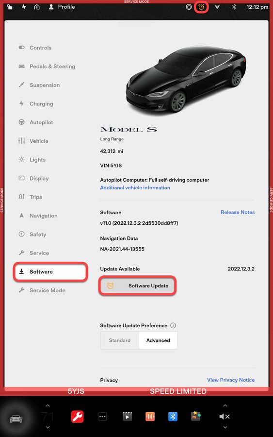 NotePre-FW 2020.48.25 hold Tesla "T" icon at top of center display for four seconds and then type "service" into Access Code box, Post-FW 2020.48.25 The Tesla T has been removed from the top bar of the UI, Press and hold for 2sec the vehicle's badge icon in Controls > Software for Access Code box