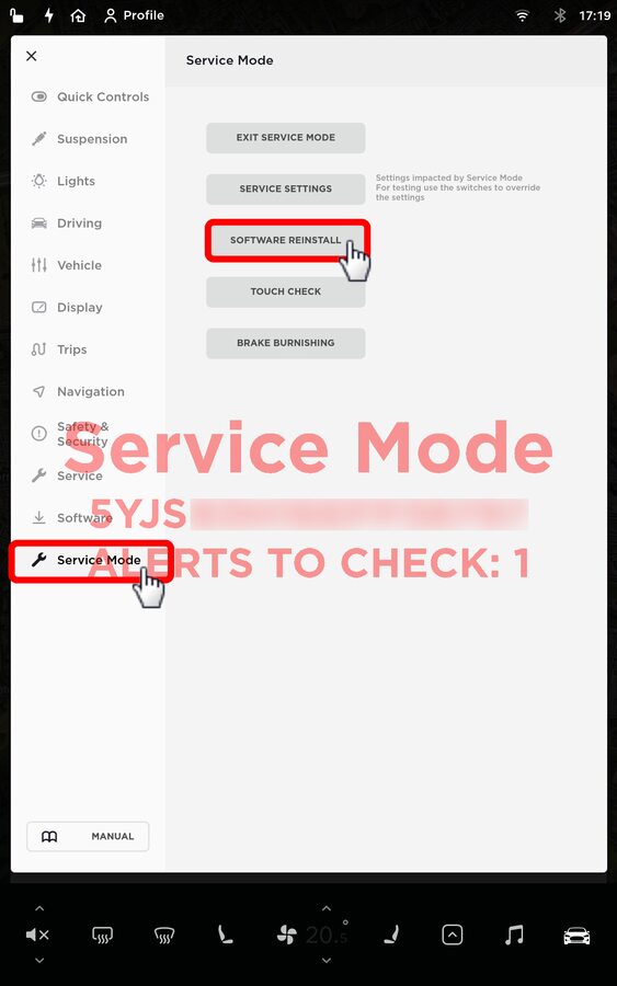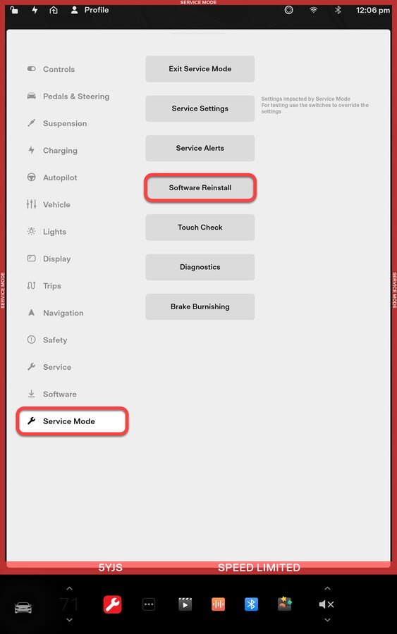 NotePress a car icon on touchscreen => Service Mode => Software Reinstall => Partial => Request, Vehicle will send a request to Tesla server for reinstallation of current firmware, Yellow clock installation icon should appear within 1 hour