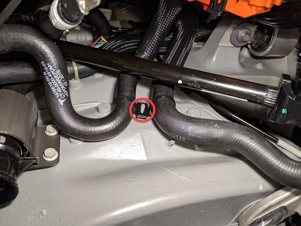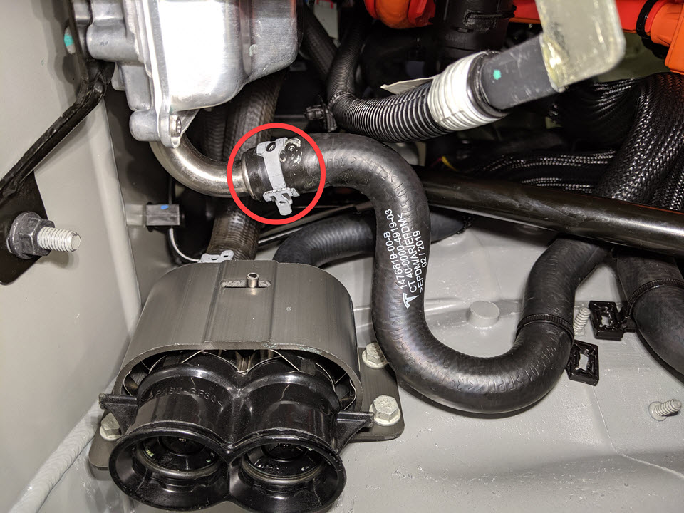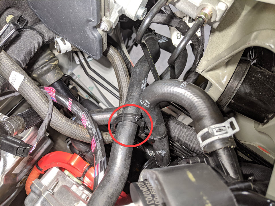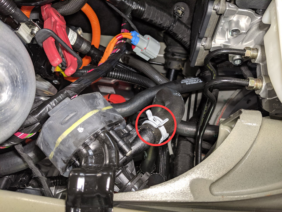 - Install the clip that attaches the hose to the front drive unit inlet hose.