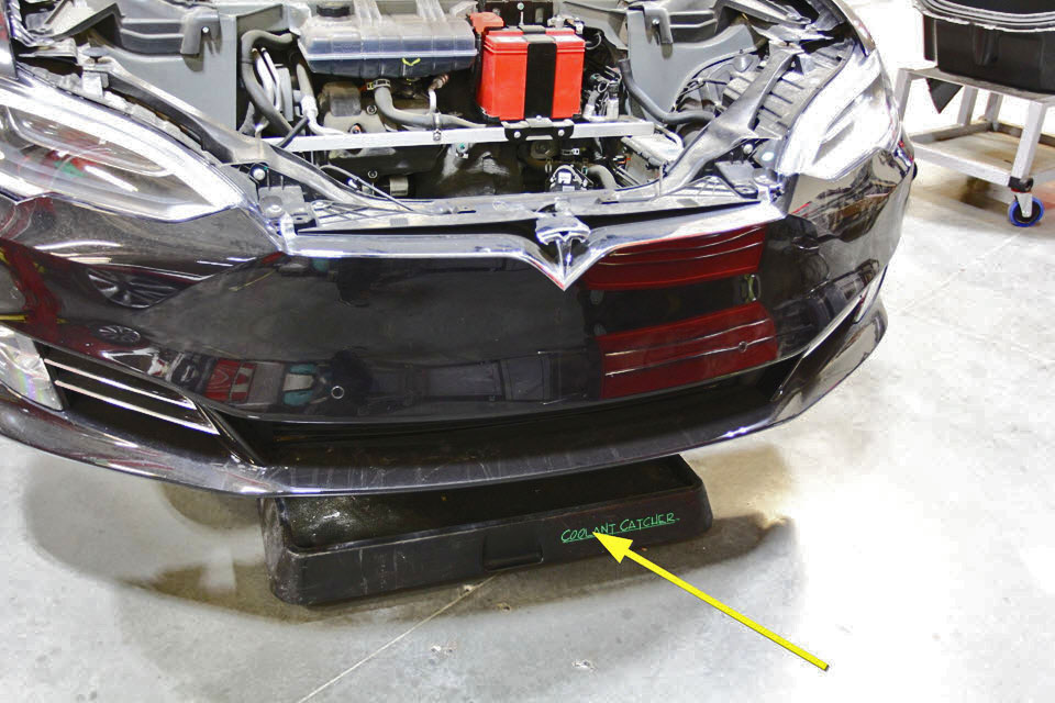 - Remove the coolant catcher from underneath the vehicle. Clean up any spilled coolant.