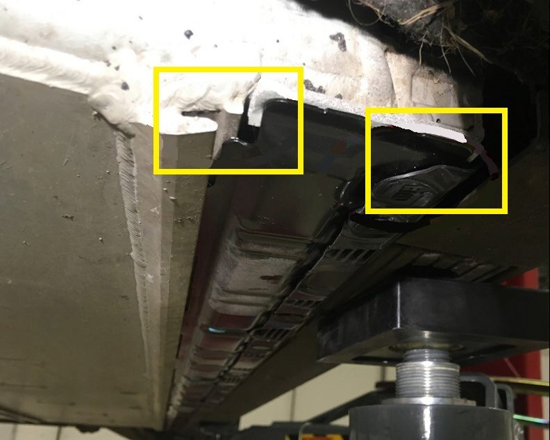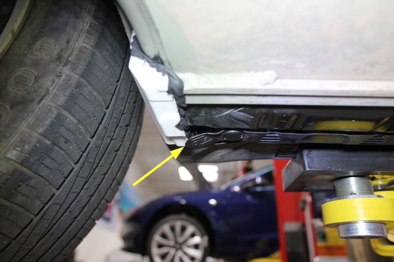 - Apply sealant to the back side of the RH battery mudflap along the yellow lines in the image.