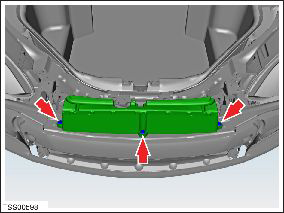 NoteIf necessary, remove the screws (x4) that secure the RH sub-cool condenser mounting clamps (torque 3 Nm) in order to access the lower outboard bolt that secures the RH side of the bumper to the crash structure.