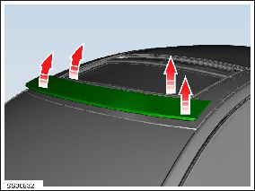 WarningTo avoid personal injury, eye protection must be worn when performing this operation.WarningOnly use cleaning agents and solvents in a well-ventilated area.CAUTIONTake care not to damage component(s).Tip: Insert a wedge between the applique and the roof frame and lift the applique up slightly to make cutting through the adhesive easier.
