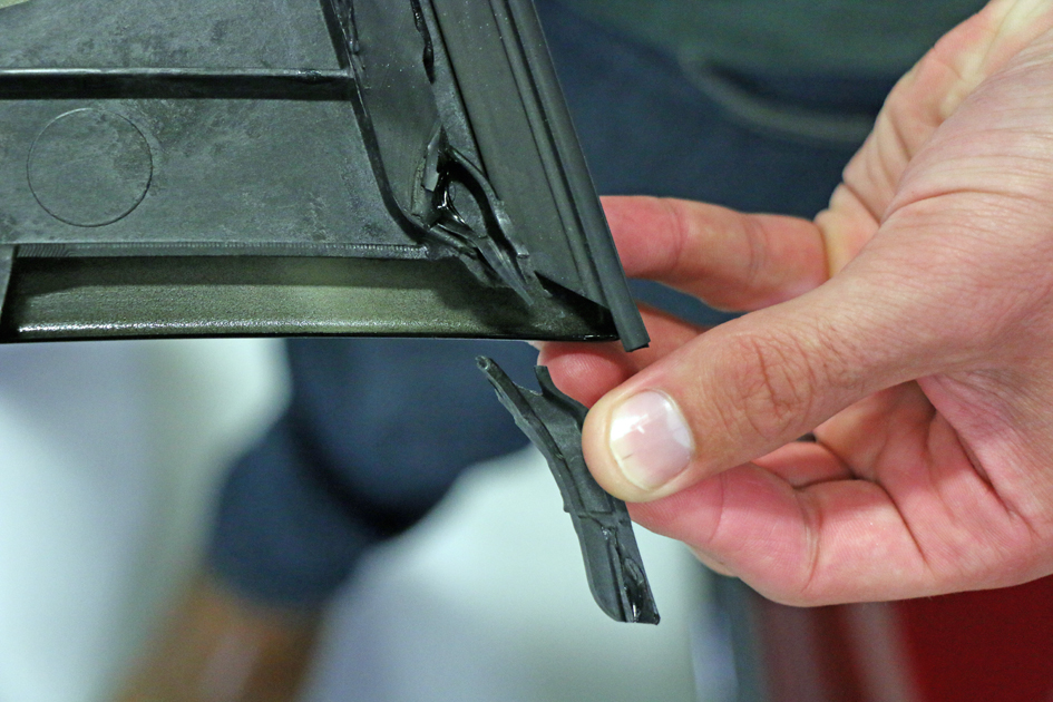 WarningTo avoid personal injury, wear cut-resistant gloves when performing this operation.NoteThe tabs help hold the corners flush with the body while the adhesive cures during assembly at the factory. These tabs are not necessary for reinstallation.