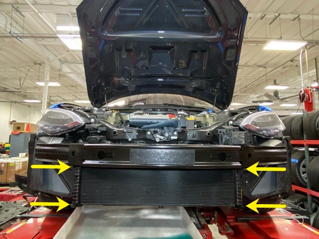 - Position the radiator into the vehicle, and then secure the tabs (x4) that attach the radiator to the front end ducting assembly.