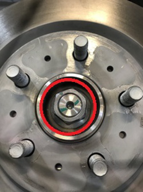 - Install the hydraulic hub puller on the LH front brake rotor using 2 lug nuts and 2 hydraulic hub puller washers.