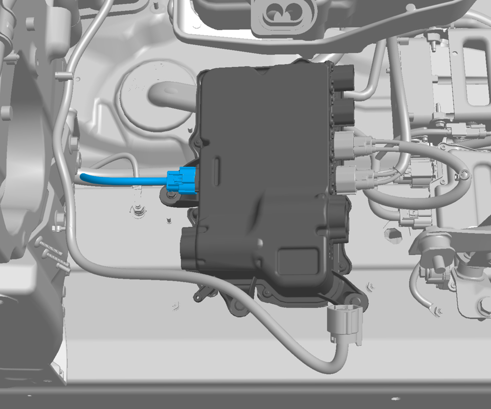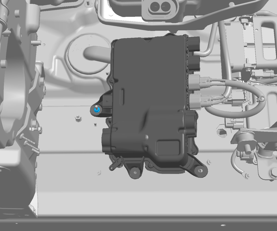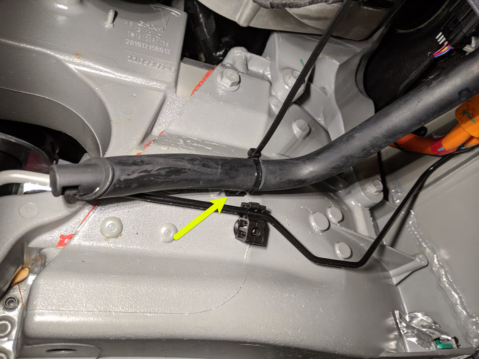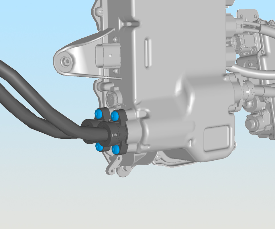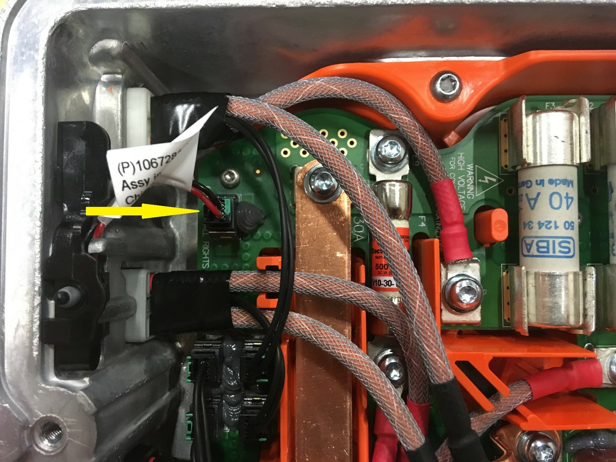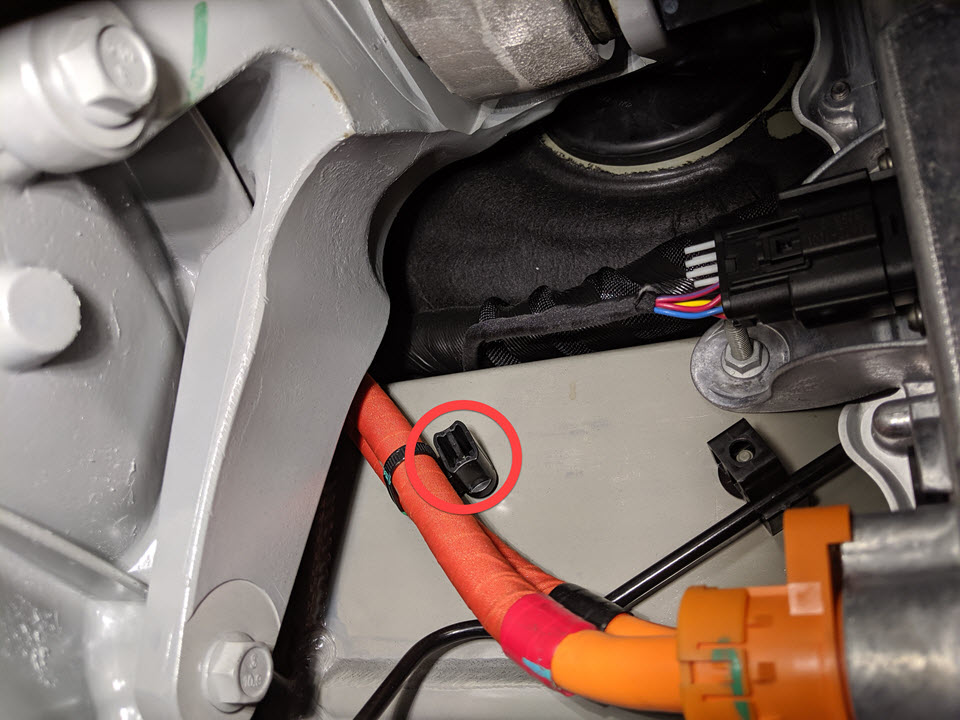 - Release the clip that attaches the HV harness to the bulkhead, allowing the HV harness to be moved out of the way for the front harness to pass behind the HV harness during removal.