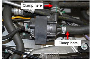 - Remove the inlet and outlet hoses from the coolant pump assembly.