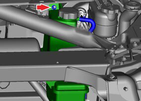 - From the LH wheelwell (RH for RHD), clamp the hose from the powertrain coolant pump to the rocker hose. Ensure that the clamp is placed just outside of the spring clamp.