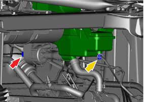 - For RHD vehicles: release the bolt that secures the coolant reservoir upper bracket to the strut brace (torque 5 Nm).