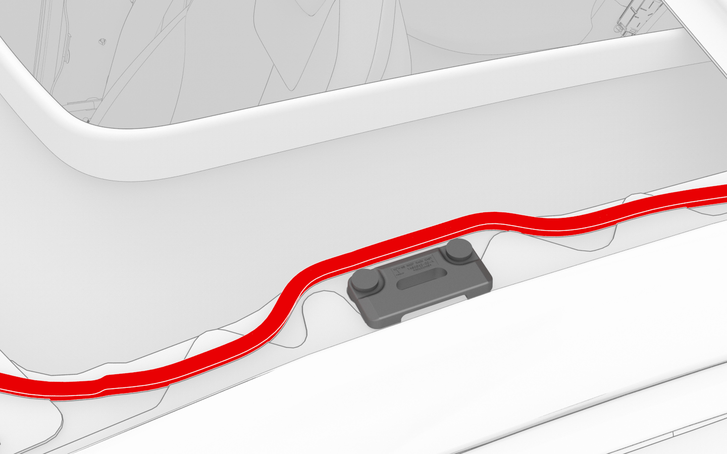 CAUTIONDo not damage the satellite radio antenna at the rear of the glass.Tip: Use a trim tool to guide the square wire over the antenna.NoteCut through the rear datum pin (near the satellite radio antenna) with the square wire.