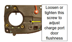 - Before installing the cable connector, close the charge port door and verify that it is 0-2 mm underflush to the body. If necessary, turn the screw to adjust the magnet that secures the charge port door.