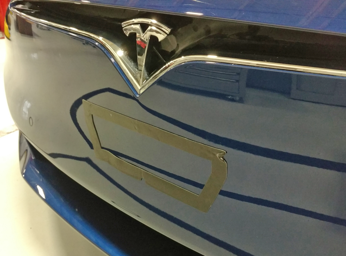 - Making sure the bracket is aligned and lifted up against the front fascia, press the front license plate bracket assembly against the front fascia. Fully wet out the adhesive on the back of the bracket assembly.